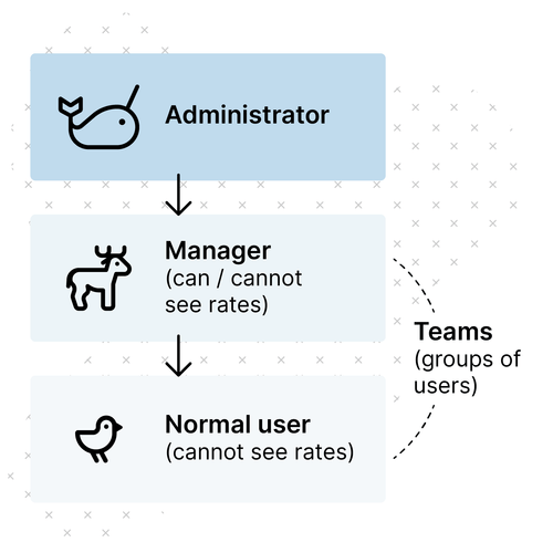 Employees or staff can track time on assigned projects, but cannot view hourly rates or see timesheets of other users. Managers can be limited to specific timesheets.